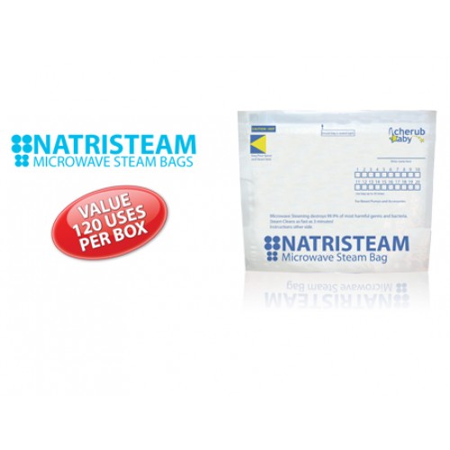 "These innovative time saving microwave steam bags sterilise your accessories, teats, bottles, dummies and breast shields in only 3 minutes! Even though they are portable and quick to use they are still as safe as a steriliser killing 99.9% of the most harmful germs and bacteria. With 20 uses from each bag you can be assured of easy sterilisation from these cost effective Natristeam bags - with 120 uses in every box! They save you from having to use a steriliser when travelling and give you the reassurance of being able to sterilise anywhere. The large, freestanding bags also comfortably fit all essential baby feeding accessories including cups, cutlery and lids.